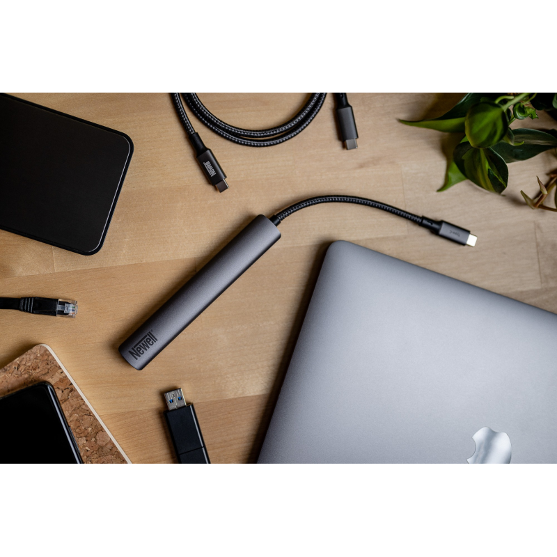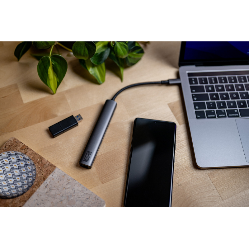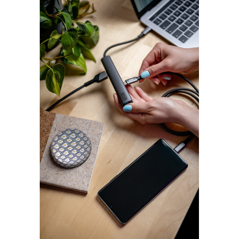 Hub Newell 6 w 1 z łatwością zmieści się w plecaku lub torbie na laptopa. Urządzenie wykonano z trwałego stopu aluminium zapewniającego trwałość i ultralekkość. Dzięki grafitowemu wykończeniu i opływowym kształtom hub świetnie wpisuje się we współczesne standardy minimalistycznego wzornictwa.