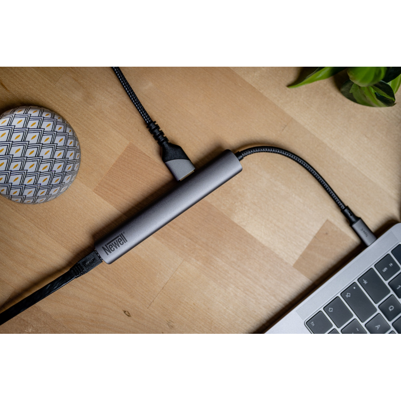 Minimalizm nowoczesnych komputerów i tabletów nie zawsze idzie w parze z funkcjonalnością. Jeśli pracujesz z kilkoma dyskami zewnętrznymi lub podłączasz do laptopa dodatkowe akcesoria, liczba dostępnych gniazd może okazać się niewystarczająca. Wówczas z pomocą przychodzi hub Newell 6 w 1. To niewielkie i poręczne urządzenie zapewni Ci dostęp do 2 portów USB 3.0, 2 portów USB-C (w tym jednego wspierającego technologię Power Delivery 100 W), portu HDMI (4K 60 Hz) i gniazda RJ45.
