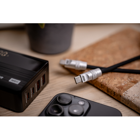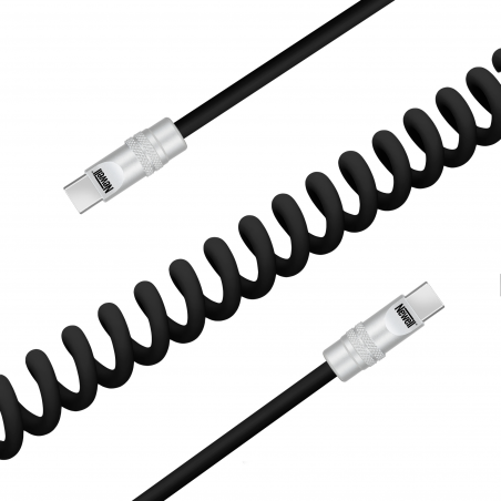 Solidne akcesoria elektroniczne poznaje się po detalach. W tym przypadku warto zwrócić uwagę na aluminiowe końcówki, które nie tylko wyglądają elegancko, ale też znacząco zwiększają odporność na zużycie. Są wytrzymałe, nie wyginają się i bez problemu znoszą intensywne, codzienne użytkowanie. Już po pierwszym kontakcie wiesz, że spiralny kabel Newell USB-C – USB-C 100 W zostanie z Tobą na dłużej – solidna konstrukcja, średnica 4,2 mm i silikonowy oplot od razu budzą zaufanie. Każdy element został tu zaprojektowany tak, by przewód służył Ci przez długie lata.