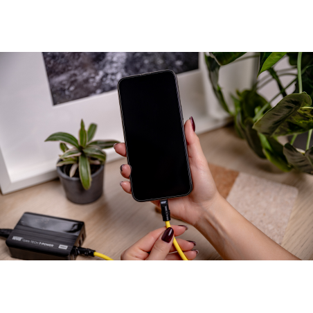 Długość spiralnego kabla Newell USB-C – USB-C 100 W po pełnym rozciągnięciu wynosi 1,5 metra. To wystarczająco dużo, by wygodnie podłączyć laptopa do ładowarki na biurku, sięgnąć z konsoli do powerbanku w plecaku albo swobodnie ładować telefon z gniazdka w aucie. To złoty środek między kompaktowymi wymiarami a zasięgiem – kabel jest krótki wtedy, gdy tego potrzebujesz i długi, kiedy z niego korzystasz.