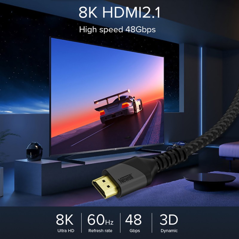 Kabel HDMI - HDMI 2.1 Newell - 2 m zapewnia wysoką jakość obrazu oraz wsparcie dla zaawansowanych formatów dźwięku. Jest w pełni kompatybilny z urządzeniami obsługującymi każdy standard HDMI i idealny do pracy z różnymi sprzętami, takimi jak: konsole do gier, odtwarzacze Blu-ray i DVD, przystawki Smart TV, projektory, telewizory, komputery, monitory, laptopy i systemy kina domowego.
