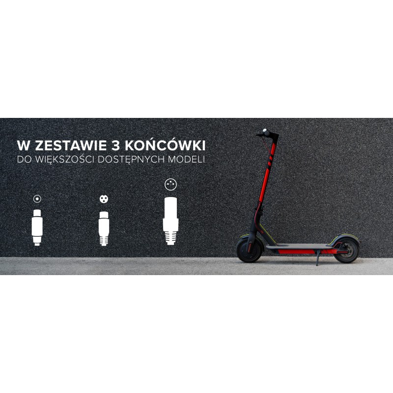 Z ładowarką Newell do hulajnóg elektrycznych Multi Set zyskasz możliwość ładowania różnych modeli ultramobilnych pojazdów, bez konieczności kupowania wielu urządzeń lub dodatkowych adapterów. W zestawie znajdziesz odpowiednie kable, które zapewnią kompatybilność z gniazdami.