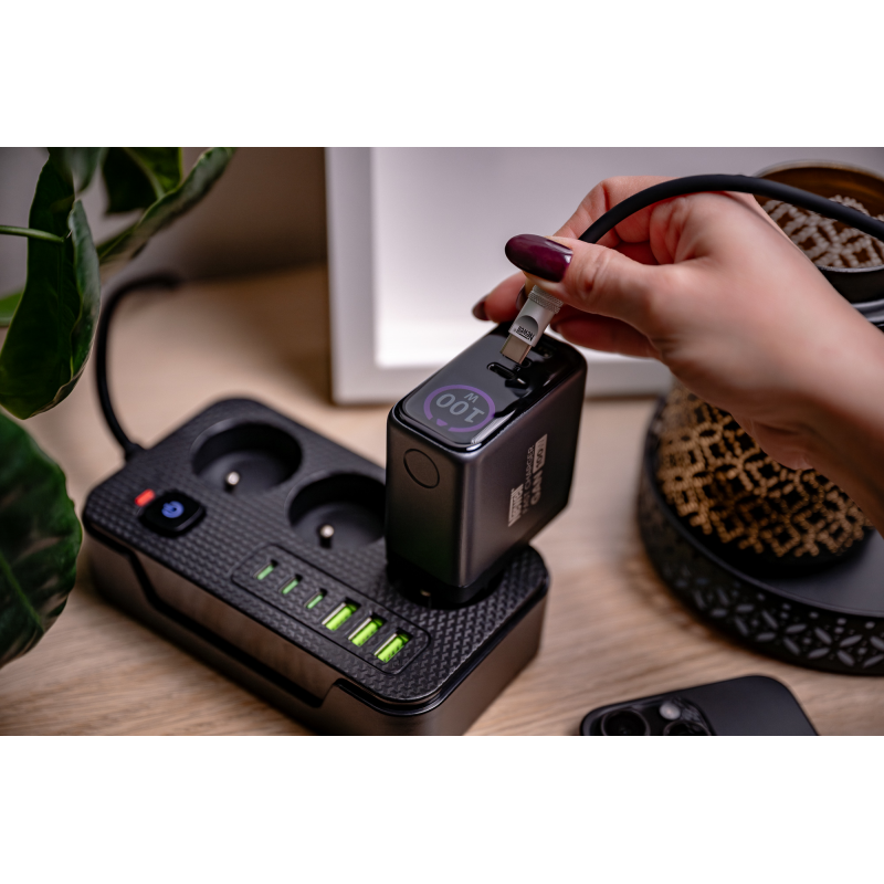 Wielozadaniowa ładowarka sieciowa Newell GaN 100 W TFT - EU to prawdziwa oszczędność miejsca i czasu. 2 porty USB-C i jedno gniazdo USB-A pozwalają na jednoczesne ładowanie nawet trzech różnych urządzeń. Niezależnie od tego, czy podłączasz do niej laptopa, smartfon i słuchawki, czy tablet i powerbank – ładowarka automatycznie dostosuje moc, aby każde urządzenie otrzymało optymalny zastrzyk energii.