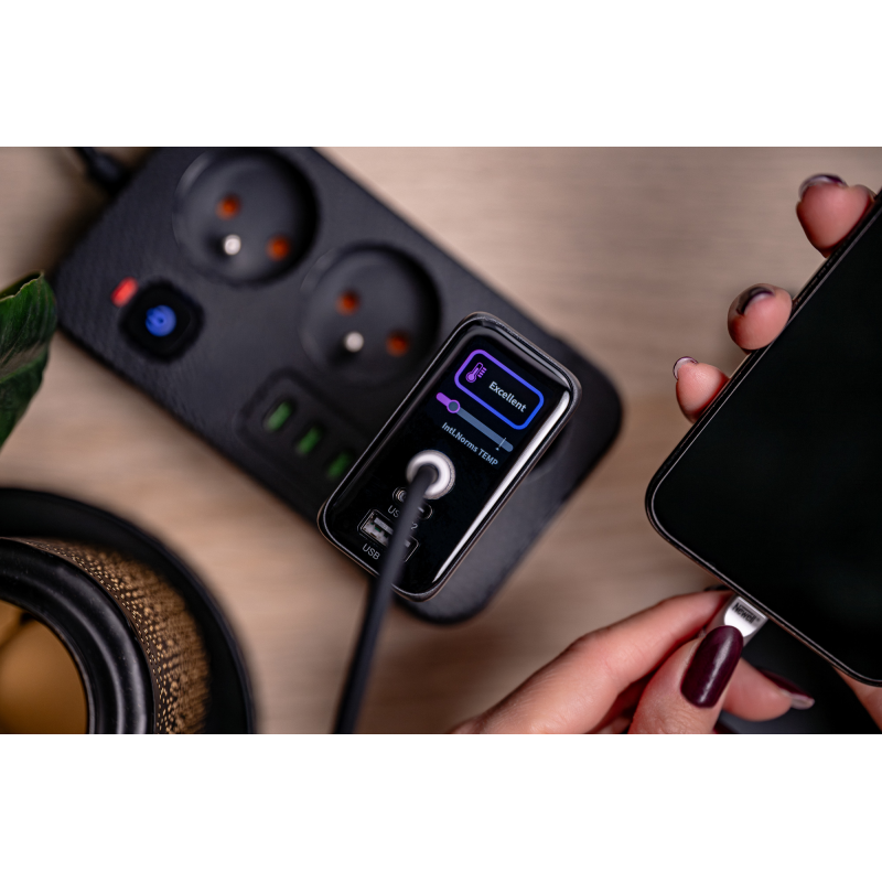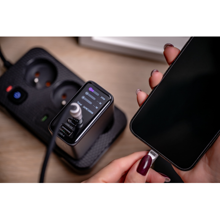 Ładowarka Newell GaN 100 W TFT została wyposażona w duży, wyraźny i podświetlany ekran TFT, który zapewnia kontrolę nad procesem ładowania. Za pomocą jednego przycisku możesz przełączać między różnymi trybami widoku – od podstawowego stanu gotowości, przez aktualny pobór mocy (całkowity lub z podziałem na poszczególne porty), aż po temperaturę pracy i łączny czas użytkowania urządzenia. Przytrzymanie przycisku umożliwia obrócenie wyświetlanych treści o 180 stopni. Dzięki temu dostosujesz orientację ekranu do tego, jak ładowarka została wpięta do gniazdka. To drobny, ale przemyślany detal, który znacząco poprawia komfort użytkowania.