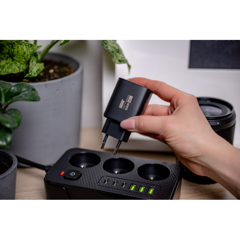 Newell GaN 65 W to idealny wybór dla osób poszukujących kompaktowej ładowarki kompatybilnej z setkami elektronicznych gadżetów i urządzeń, takich jak: tablety, smartfony, słuchawki Bluetooth, latarki lub czytniki e-booków. Dzięki portom USB-C oraz USB-A umożliwia wygodne uzupełnianie energii w 3 urządzeniach jednocześnie, przy maksymalnej mocy wyjściowej na poziomie 65 W. Wykorzystując innowacyjną technologię szybkiego ładowania GaN, jest bardziej wydajna i zajmuje mniej miejsca niż tradycyjne ładowarki krzemowe. Wspierana przez technologie Power Delivery oraz Quick Charge, zapewnia bezpieczne i szybkie ładowanie. Nowoczesne zabezpieczenia chronią Twój sprzęt przed przepięciami i zwarciami. Produkt objęty 40-miesięczną ochroną producenta.