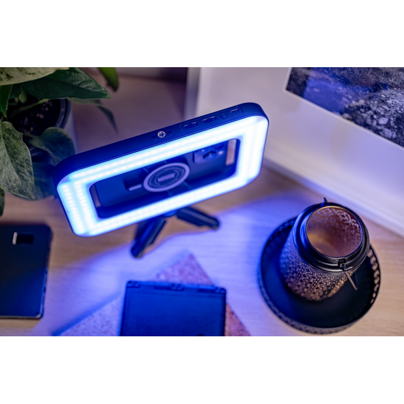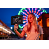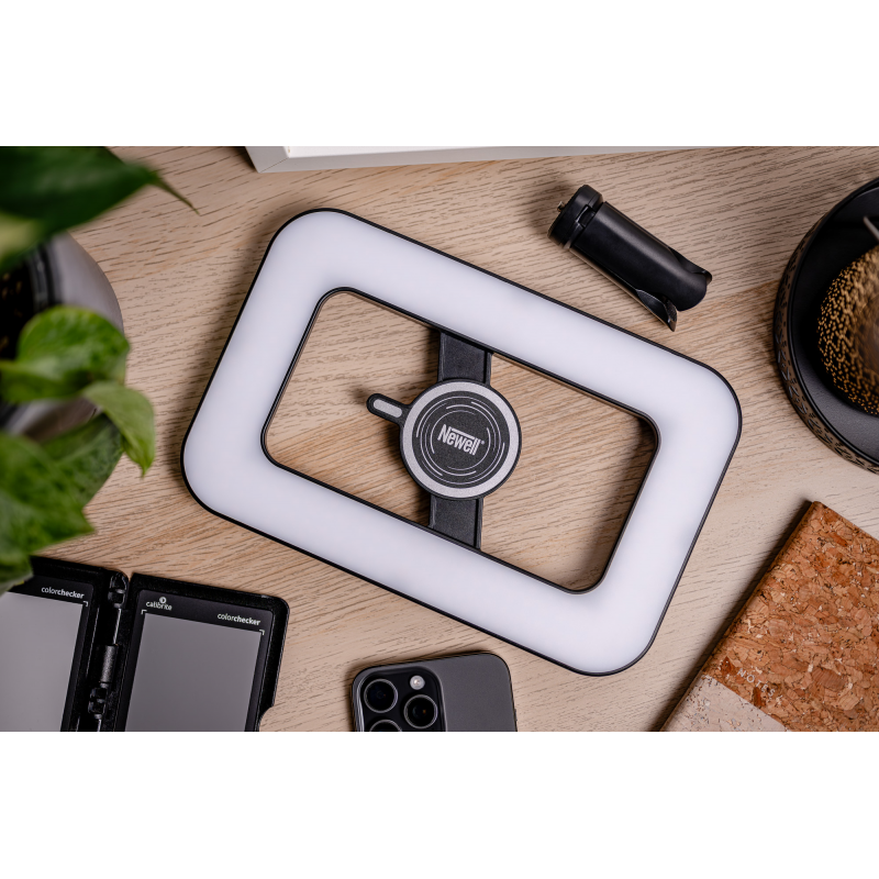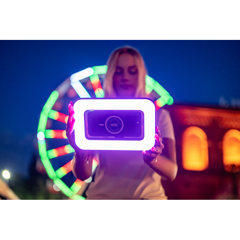 Newell Freya to nowoczesna lampa LED z magnetycznym mocowaniem na smartfon, łącząca światło, uchwyt i funkcję klatki operatorskiej w jednej, kompaktowej konstrukcji. Dzięki technologii MagSafe (lub dołączonemu pierścieniowi) stabilnie zainstalujesz swój telefon w centralnej części ramy. Cztery panele LED zapewniają równomierne doświetlenie kadrów. W razie potrzeby możesz wyłączyć wybrane segmenty. Regulowana temperatura barwowa (2500–6500 K), pełne spektrum kolorów RGB (0–359°), CRI 95+ i wbudowany akumulator 3000 mAh dają pełną swobodę pracy. W zestawie ministatyw i trzy gwinty 1/4” do montażu dodatkowych akcesoriów. Idealna do vlogów, transmisji, zdjęć i kreatywnych ujęć – w studio i w terenie. Produkt objęty 40-miesięcznym programem wsparcia Newell.