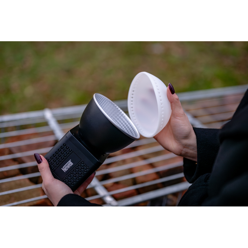 Wybierając lampę Newell Tara 40 RGB otrzymujesz dodatkowe narzędzia pozwalające jeszcze lepiej kontrolować charakter oświetlanych scen. W zestawie znajdziesz czaszę 55º, która skupia strumień światła, zwiększając jego intensywność i pozwalając precyzyjnie podkreślić wybrane elementy kadru. To świetne rozwiązanie, gdy zależy Ci na mocnym, punktowym oświetleniu. Do bardziej miękkich, naturalnych efektów możesz sięgnąć po silikonowy dyfuzor, który równomiernie rozprasza światło i eliminuje ostre cienie. Dzięki tym dwóm modyfikatorom lampa jest gotowa do pracy w różnych sytuacjach – od dynamicznych vlogów po subtelne zdjęcia portretowe.