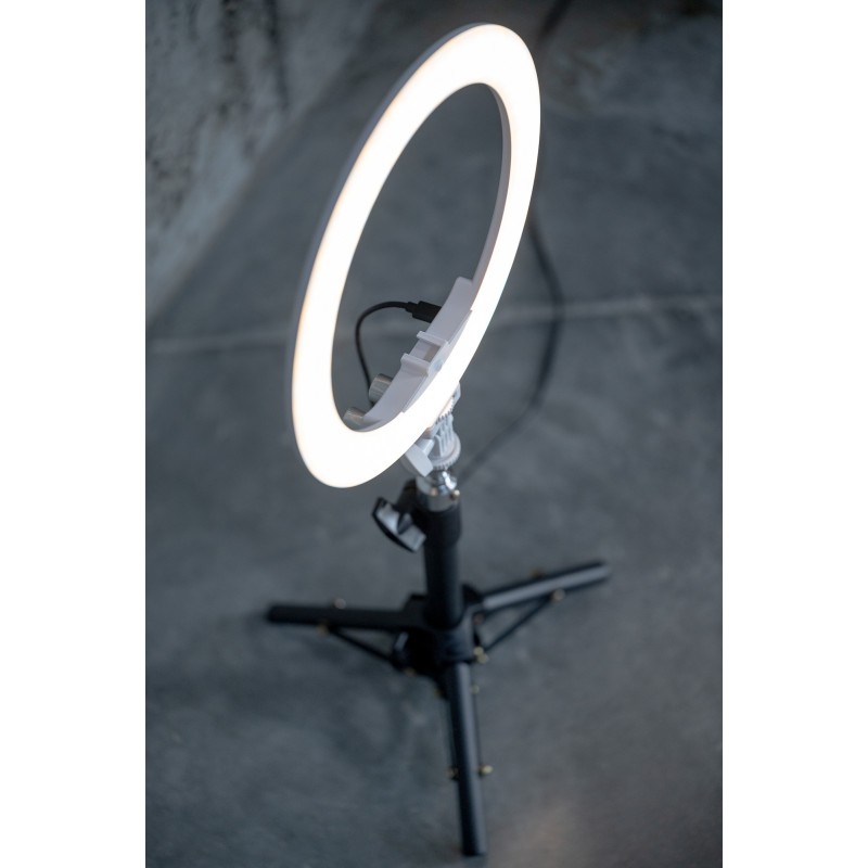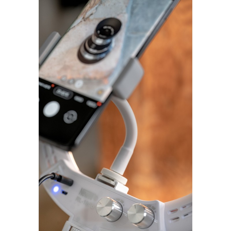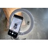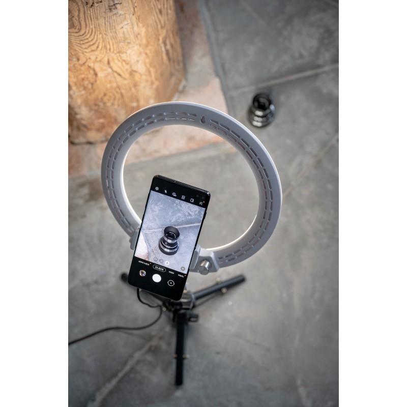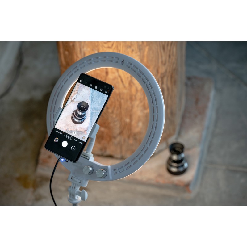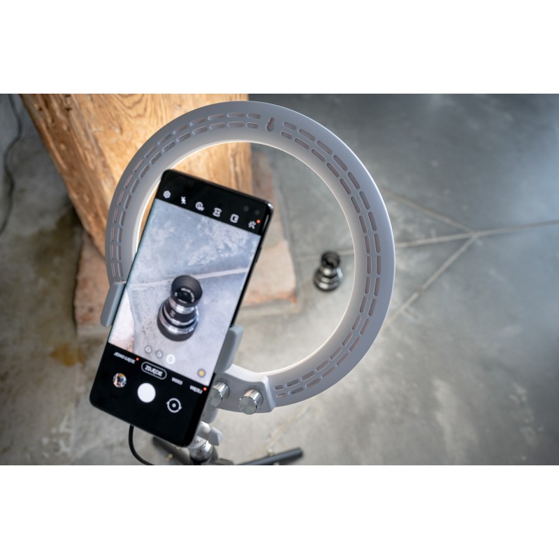 Lampę wyposażono w niewielką prowadnicę umożliwiającą wpięcie uchwytu na smartfon lub aparat. Oba te akcesoria znajdziesz w zestawie, dzięki czemu urządzenie będzie gotowe do użycia zaraz po rozpakowaniu. Uchwyt na smartfon wyposażono w elastyczne ramię i głowicę kulową. Dzięki temu precyzyjnie ustawisz kadr niezależnie od tego, co będzie tematem Twojego zdjęcia!