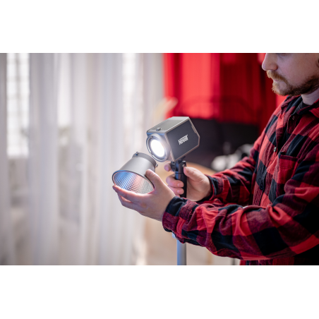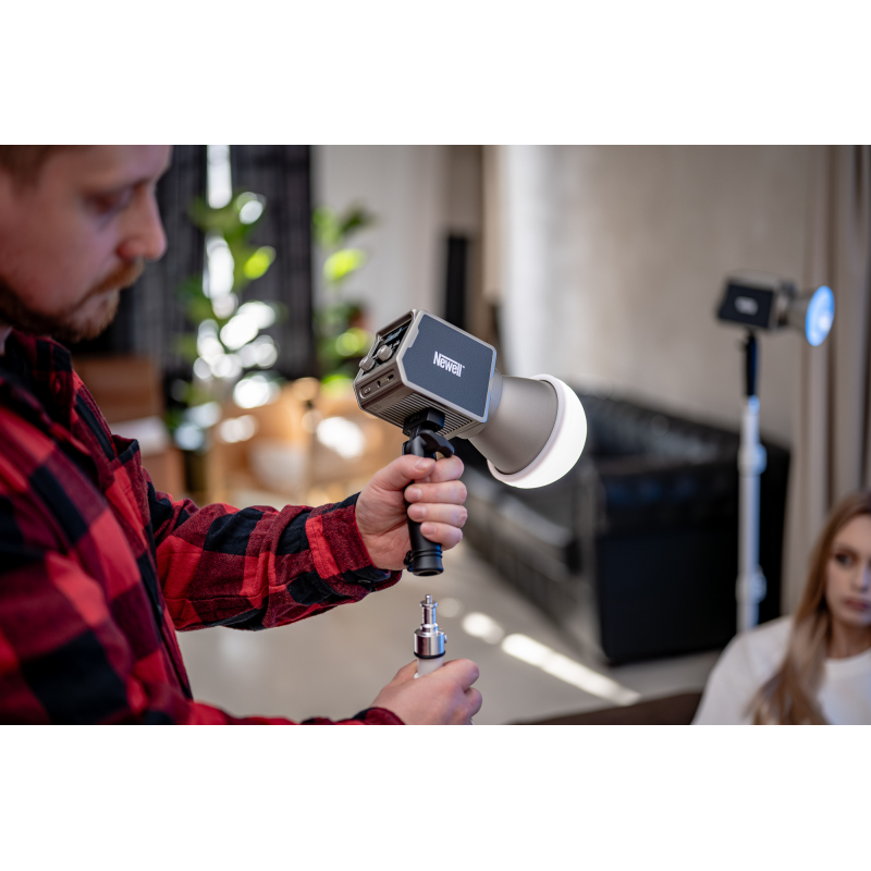 W zestawie z lampą Newell Zora 60 WB znajdziesz ergonomiczny uchwyt ręczny, który pozwala wygodnie pracować ze światłem w ruchu – idealnie sprawdzi się podczas filmowania z ręki, dynamicznych sesji zdjęciowych w plenerze czy vlogowania. Rączkę połączysz z lampą za pomocą standardowego gwintu 1/4”, który gwarantuje szybki montaż i pełną kompatybilność z innymi akcesoriami. Uchwyt może pełnić także funkcję adaptera. Umożliwia on instalację lampy na statywie oświetleniowym, dzięki czemu z łatwością przejdziesz z mobilnego trybu pracy do klasycznej konfiguracji studyjnej.