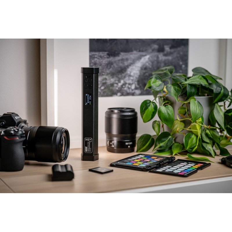 Wewnątrz obudowy podłużnego panelu LED ukryto akumulator o pojemności 2500 mAh. Zapewnia on do 100 minut pracy z wykorzystaniem maksymalnej jasności światła i najwyższej dostępnej temperatury barwowej. Gdy urządzenie się rozładuje, po prostu podłącz je do ładowarki lub power banku, przy pomocy dołączonego do zestawu kabla USB-C.