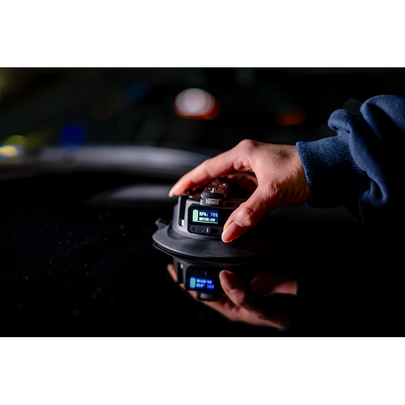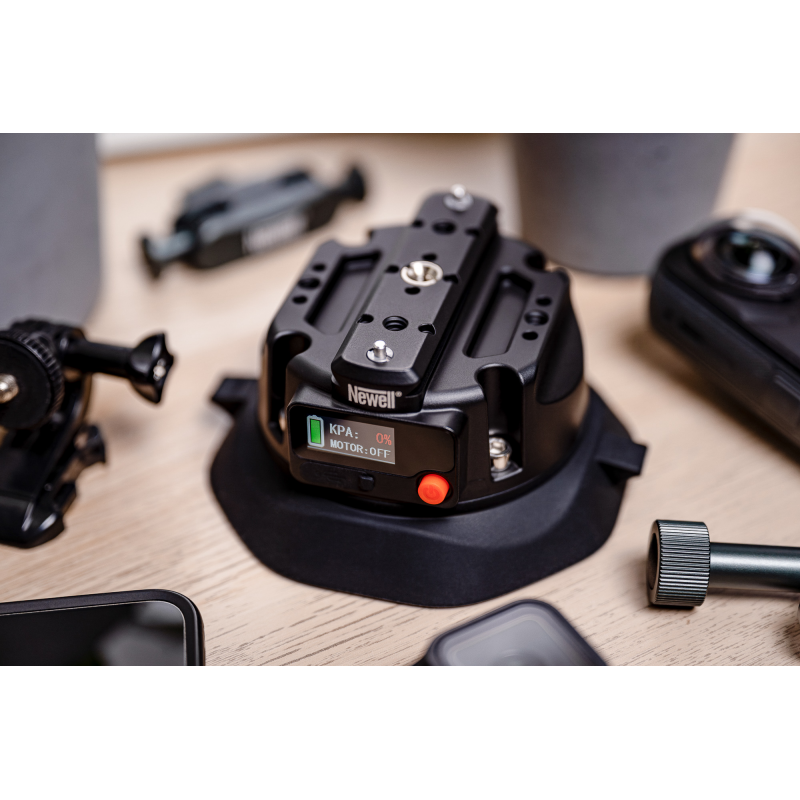 Przyssawka elektryczna Newell to zaawansowane rozwiązanie montażowe dla branży foto-video. Wystarczy jedno naciśnięcie przycisku, aby uzyskać solidne i pewne połączenie z płaskimi powierzchniami. Maksymalna nośność na poziomie 35 kg umożliwia bezpieczny montaż aparatu, kamery czy zaawansowanego setupu video. Inteligentny system kontroli co 1000 sekund sprawdza poziom ciśnienia i w razie potrzeby automatycznie je uzupełnia. Uniwersalne mocowania – gwinty 1/4" i 3/8", szyna NATO oraz otwory Arri – gwarantują kompatybilność z setkami akcesoriów foto-video. Jedno ładowanie zapewnia stabilne połączenie przez 72 godziny. Cyfrowy wyświetlacz informuje o stanie akumulatora, poziomie ciśnienia i statusie pracy. Produkt objęty 40-miesięcznym programem ochrony Newell.