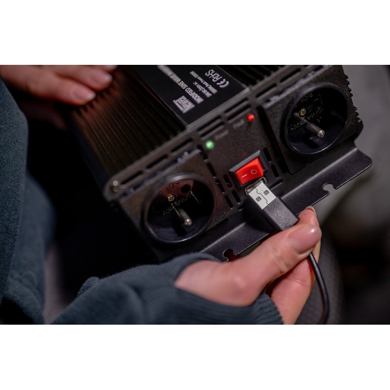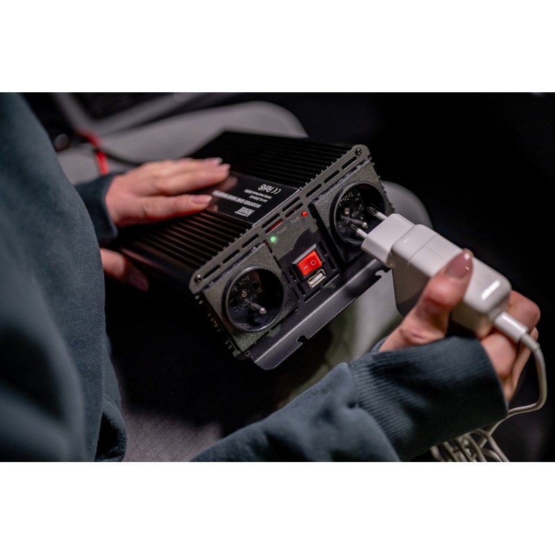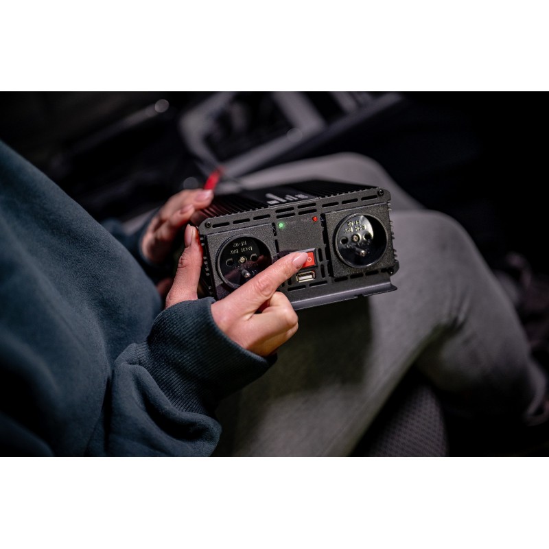 Przetwornica napięcia Newell z modyfikowaną sinusoidą - 24 V / 230 V, 1000 W to idealny wybór dla osób, które często podróżują lub chcą korzystać z ulubionych urządzeń wszędzie tam, gdzie nie ma dostępu do tradycyjnych gniazdek elektrycznych. Dzięki niej Twoim uniwersalnym źródłem zasilania stanie się akumulator. Urządzenie wyposażono w 2 tradycyjne gniazdka elektryczne (standard E) oraz 1 gniazdo USB-A. Do przetwornicy z łatwością podłączysz takie urządzenia jak grzałki, laptopy, smartfony, tablety, szlifierki i wiele innych. Maksymalna moc użytkowa inwertera wynosi 1000 W. W zestawie, oprócz zwykłych przewodów, znajdziesz wygodne w użyciu kable z zaciskami (klemy), które ułatwią podłączanie urządzenia do akumulatorów.