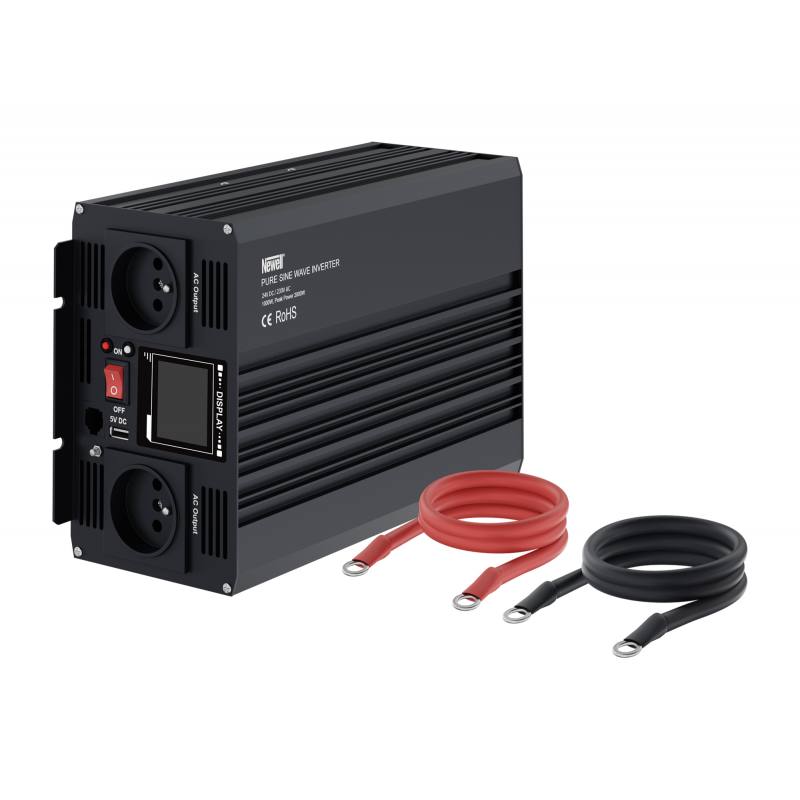 Przetwornica napięcia Newell z czystą sinusoidą - 24 V / 230 V, 1000 W to zaawansowany technologicznie falownik, który zapewnia niezawodne zasilanie dla urządzeń wymagających napięcia przemiennego 230 V. To doskonały wybór dla posiadaczy kamperów i kierowców ciężarówek. Dzięki przetwornicy Newell możesz korzystać z 2 gniazdek elektrycznych i portu USB wszędzie tam, gdzie dostęp do prądu jest ograniczony, a jego jedynym źródłem jest akumulator 24 V. Bezpieczeństwo pracy zapewniają odpowiednie zabezpieczenia – przed przepięciem, zwarciem, przegrzaniem i przeładowaniem, a także certyfikaty CE i RoHS. Urządzenie posiada inteligentny system chłodzenia, podświetlany ekran oraz kompaktową, wytrzymałą obudowę. W zestawie znajdziesz również kable do akumulatora z końcówkami oczkowymi.