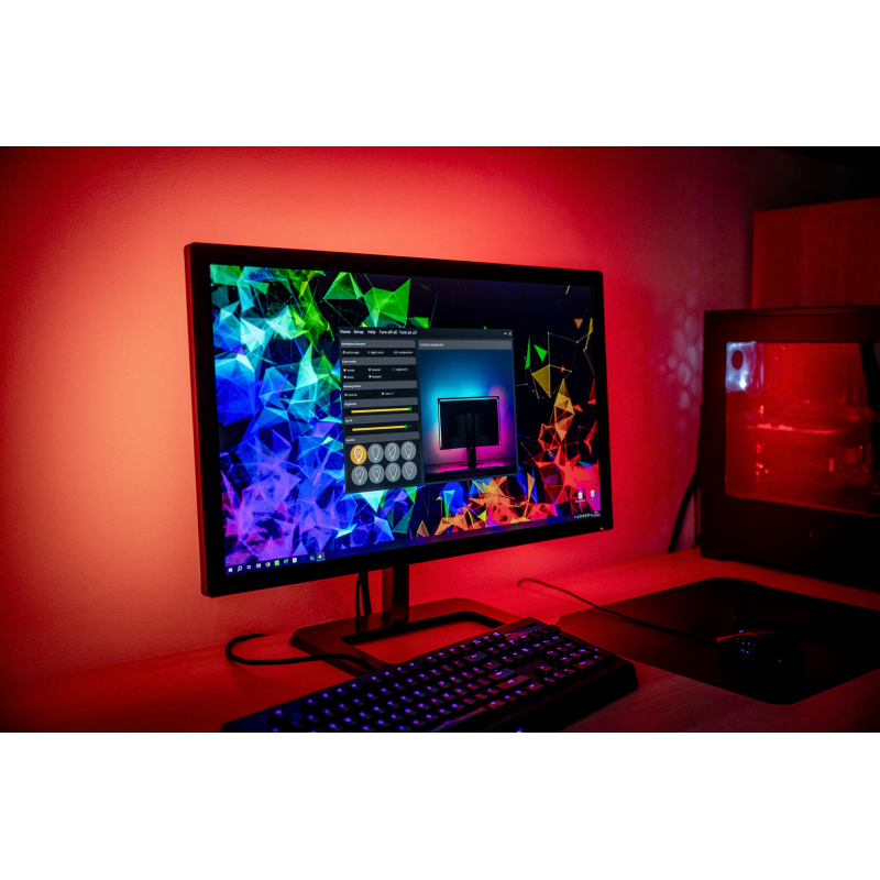 Taśma LED Newell sprawi, że wszystko, co dzieje się na Twoim monitorze o przekątnej od 21,5" do 24" zyska nową jakość, przenosząc się poza jego ramy. Urządzenie reaguje w czasie rzeczywistym na zmieniający się obraz, emitując światło o takich samych kolorach i intensywności (technologia w stylu Ambilight). Taśma może też synchronizować się z muzyką lub innymi dźwiękami, tworząc dynamiczne efekty świetlne i podkreślając rytm. Na pokładzie nie zabrakło również opcji klasycznego podświetlenia w jednym kolorze (szeroki wybór barw w przestrzeni RGB). Instalacja modułów jest prosta i szybka. Solidne połączenie zapewnia mocna taśma montażowa 3M. Produkt spełnia normę IP44 i jest objęty 40-miesiączną gwarancją. W zestawie pendrive z oprogramowaniem.