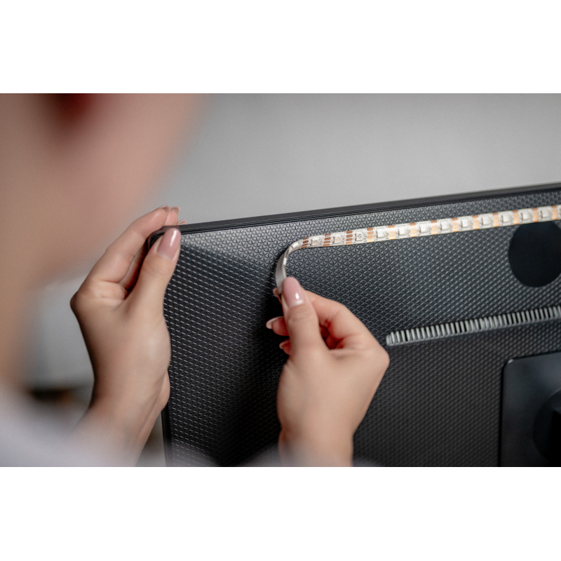Połączenie LED-owych pasków z Twoim monitorem zajmie zaledwie kilka minut. Nie wymaga to sięgania po żadne dodatkowe narzędzia. Zastosowanie mocnej taśmy renomowanej firmy 3M to gwarancja solidnego połączenia na lata. Urządzenie spełnia też normę IP44. Oznacza to, że LED-y są chronione przed ciałami stałymi o średnicy 1 mm lub większej, a także przed bryzgami wody.