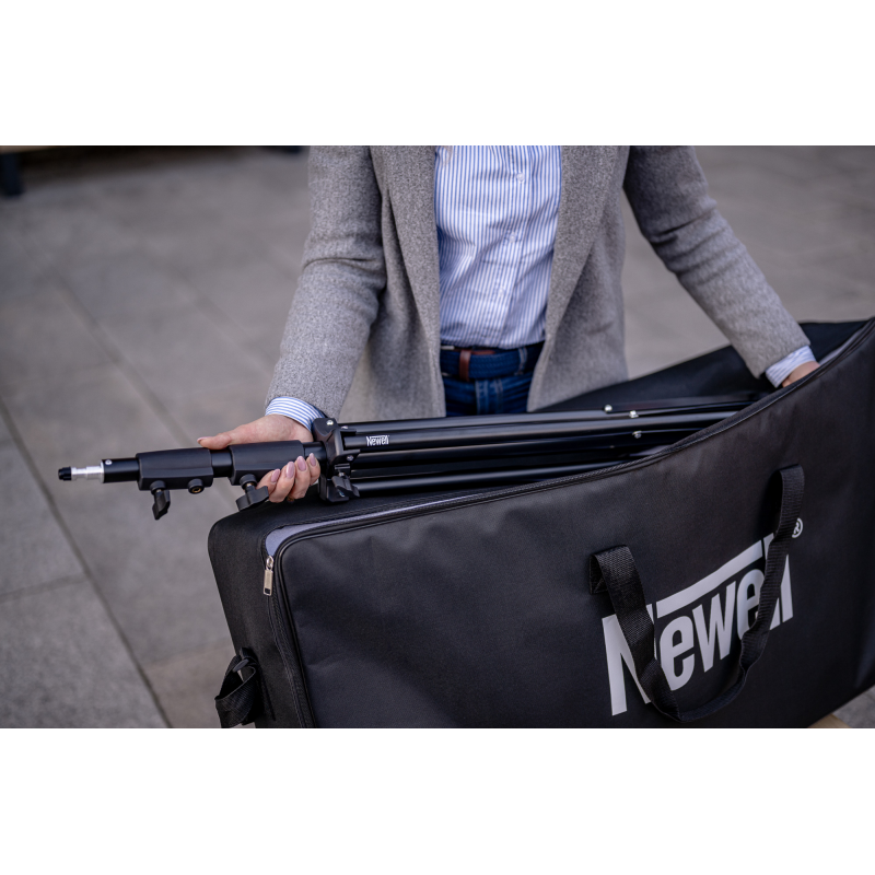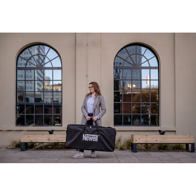 Dopełnieniem zestawu jest statyw Newell Talos – solidna, aluminiowa konstrukcja o imponującej maks. wysokości 280 cm i udźwigu aż do 6 kg. Dzięki szerokiemu rozstawowi nóg i blokowanym sekcjom zyskujesz pewność, że Twoje światło pozostanie dokładnie tam, gdzie je ustawisz – bez chybotania i stresu. Niezależnie od tego, czy pracujesz z lekkim panelem LED, czy cięższą konfiguracją z akumulatorami, Talos gwarantuje pełną stabilność.