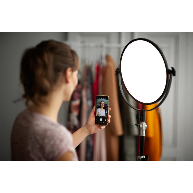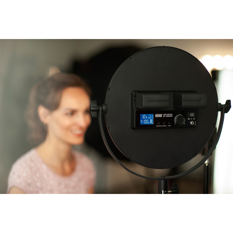 Newell Air Artha to duży okrągły panel LED o średnicy 30 cm, który skutecznie poprawi jakość Twoich zdjęć i produkcji video. Dzięki wbudowanemu dyfuzorowi uzyskasz przyjemne, miękkie oświetlenie bez konieczności sięgania po dodatkowe akcesoria. Możliwość regulacji temperatury barwowej (w zakresie od 3200 do 5600 K) i mocy światła sprawia, że bez trudu dopasujesz nastrój i charakter sceny do swoich potrzeb. Wszystkich niezbędnych zmian w ustawieniach w wygodny sposób dokonasz z poziomu podświetlanego ekranu, pilota lub aplikacji mobilnej.